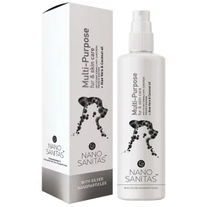 Baseret på vores NanoSanitas-teknologi er denne spray designet til at håndtere hud- og pelsproblemer hos små til store dyr (heste, hunde osv.). Denne multifunktionelle spray, velegnet til følsom hud, renser og opfrisker dyrets pels, da den hæmmer patogener og væksten af skadelige bakterier og mikrober. Det kan sikkert bruges direkte på kæledyrets hud eller pels, selv ved tilstedeværelse af sår, irritationer eller afskrabninger, da det fremmer vævsregenerering. Dette miljøvenlige produkt (uden parabener og silikoner) har ingen bivirkninger og kan påføres sikkert omkring kæledyrets mund, øjne og næse.